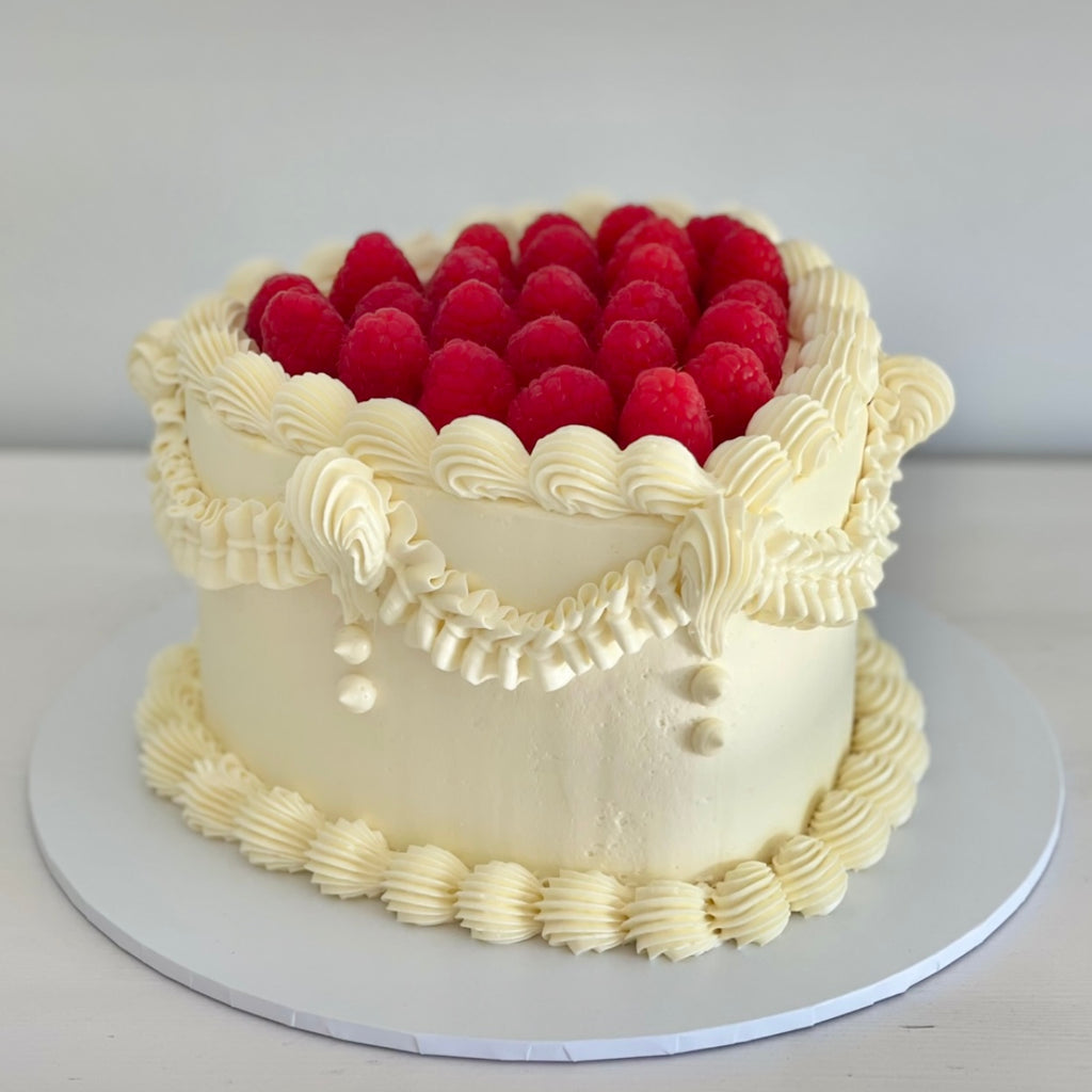 Elegant and nostalgic, this cake is a beautiful choice for weddings, engagements, birthdays, or any special occasion. Covered in silky buttercream and topped with a layer of fresh, plump berries, it’s finished with vintage style piping and delicate frill detailing.