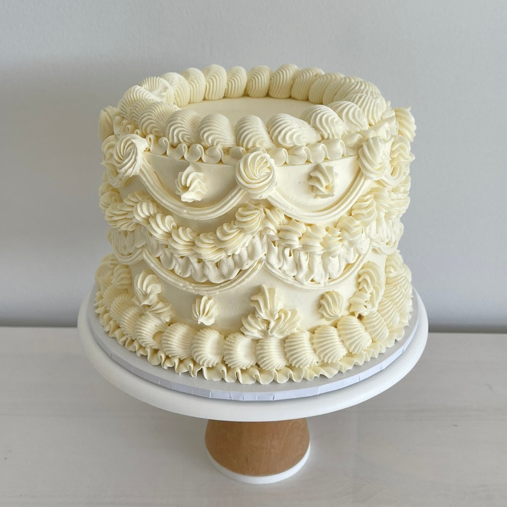 A vintage style Lambeth cake, decorated in smooth ivory buttercream with layers of ornate piped boarders. Delicate ruffles and shell piping cascade around the cake for a soft romantic touch. Elegant and timeless, this design makes a beautiful centrepiece for any celebration. (Additional colour options available upon request).